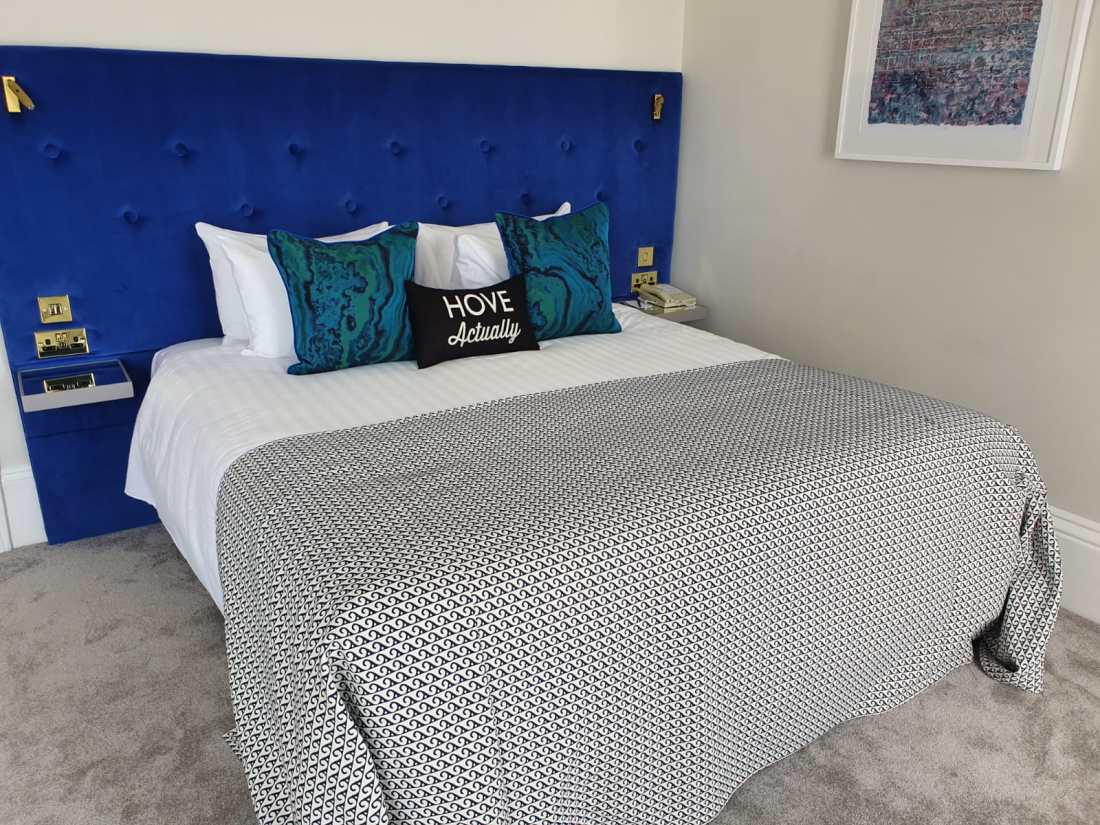 So, this weekend I packed my bags and headed into town to the Mercure, which is located right on the seafront, near the iconic West Pier and Bandstand, it’s in a beautiful location and perfect for weekend breaks in the city as it’s walking distance to all the popular sights, shops, restaurants and bars. The hotel is a stunning regency listed building, the new renovations a blend of Regency splendour mixed with quirky Brighton charm. When I walked into the lobby I was greeted by a gorgeous dark blue inky lobby, filled floor to ceiling with artwork – the staircase displaying grand pieces of art, with a gold rail – it was quite something!